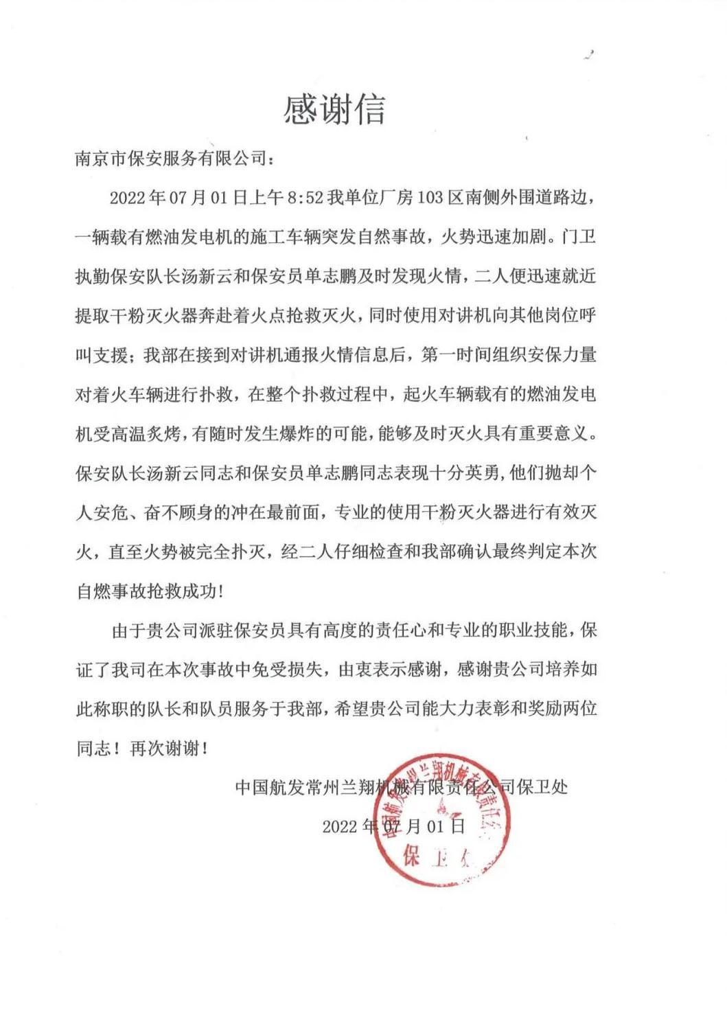 近期,南京市保安服務有限公司收到了一封來自中國航發(fā)常州蘭翔機械有限責任公司保衛(wèi)處的感謝信,信中對駐點保安員湯新云和單志鵬不顧自身安危、奮不顧身,及時處置火情保護駐點安全的行為表示衷心感謝。